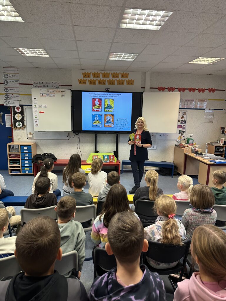 Im Rahmen des Lesefestivals HEIMSPIEL 25 kamen die 4. Schuljahre unserer Schule am 19.11.25 in den Genuss einer interaktiven Autorenlesung. Sabine Zett las aus ihrem „Schultagebuch“ und entfachte große Begeisterung bei den Kindern, die gespannt der Geschichte folgten und unbedingt wissen wollten, wie sie weitergeht. Anschließend nutzen sie Gelegenheit, viele Fragen rund um das Schreiben, die Entstehung eines Buches und den Alltag einer Autorin zu stellen.